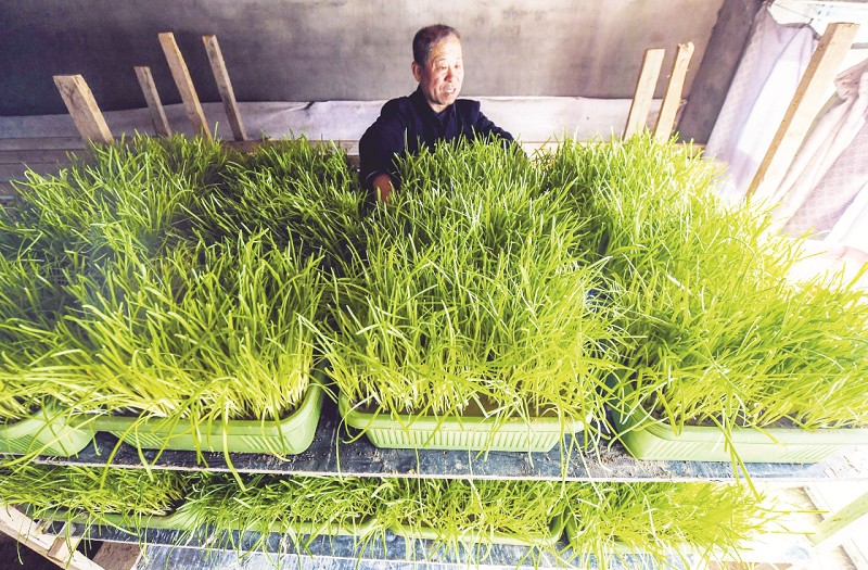 圖為日前永清縣永清鎮北園子村農民在管理盆栽黃芽韭菜。