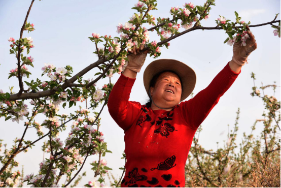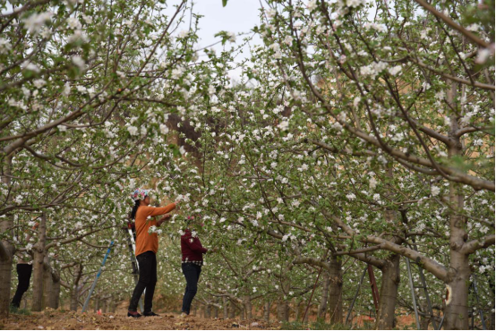 山西新聞網訊(陳彥明 呂桂明)4月8日,吉縣文城鄉大圪塔村果農給蘋果樹疏花。