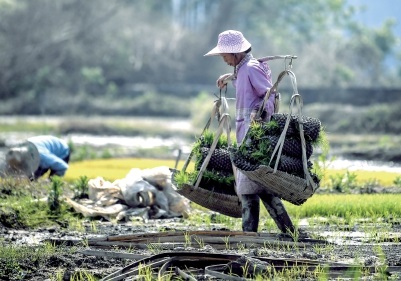 4月15日,廣西柳州市融安縣潭頭鄉西岸村農民在挑運秧苗。連日來,融安縣農民緊抓時令,開展春種生產。