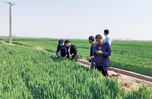 新鄉縣農技工作人員在察看小麥長勢。