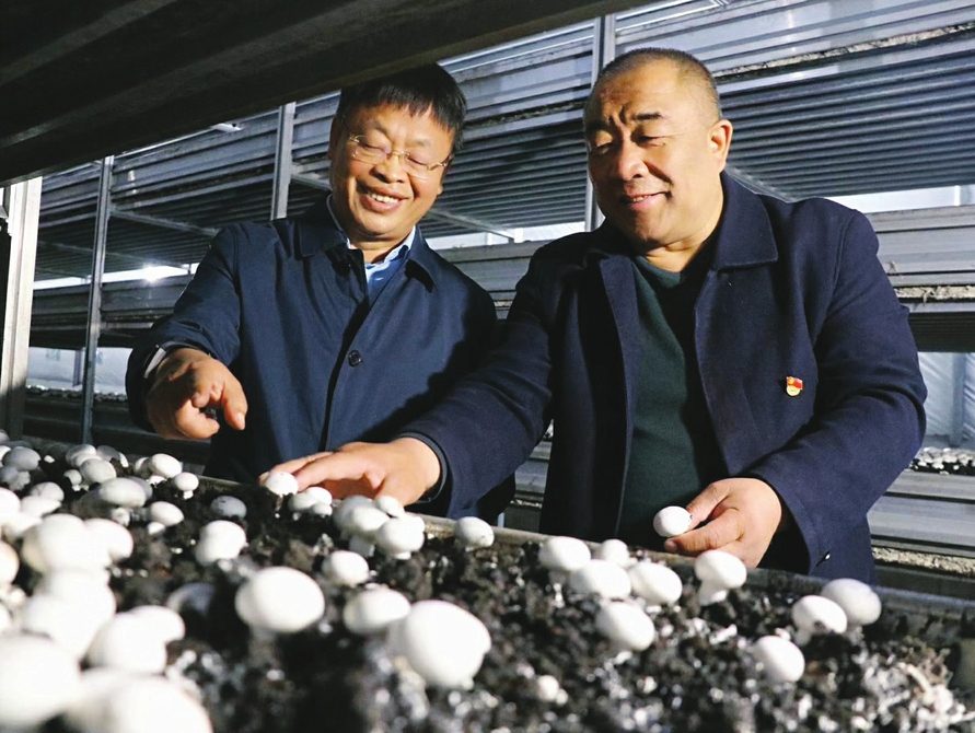 山西農業大學食品科學與工程學院常明昌教授在食用菌扶貧項目上送技術上門,帶村民致富。圖為,4月底,汾西縣團柏鄉茶房村,常明昌教授(左)指導雙孢菇工廠化生產和羊肚菌栽培。