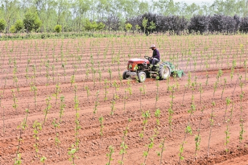 5月29日,山西農業大學果樹研究所太谷區實驗基地,一名工作人員正在玉露香改良果園旋耕土地。