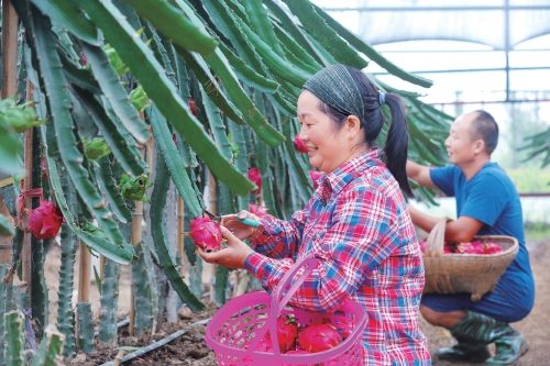 近日,河南省信陽市光山縣紫水街道辦事處前樓村農民梅賢寶和妻子劉恩芳在收獲火龍果。夫妻倆於2017年返鄉創業,開辦賢寶家庭火龍果種植農場,並從台灣引進軟枝大紅火龍果苗及種植技術,畝均收入可達3.5萬元。農場長期吸納16名村民在家門口務工,大忙季節臨時用工人數達60余人。