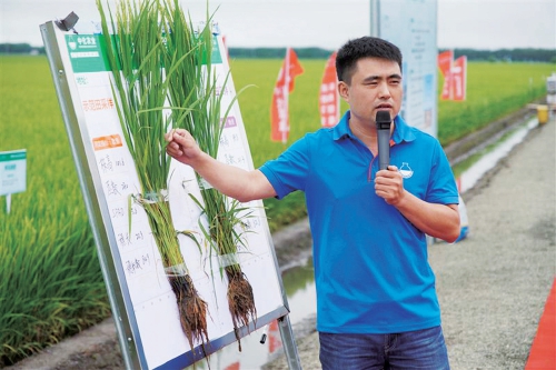 中化農業有關技術人員在現場講解水稻側深施肥效果。