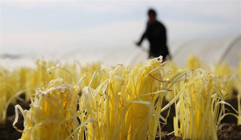 韭黃一般需要栽培20天左右的時間,待其長到35厘米以上、頂端開始枯萎時就可以收割了。收割時先揭去草帘,將韭黃葉片扶向一側,把土扒開到露出韭根時,離地面1.5厘米平直收割即可。