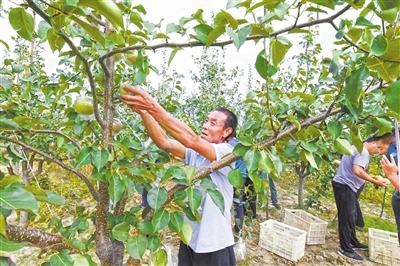 日前,隰縣陽頭升鄉上河村的400畝玉露香梨喜獲豐收,特級果地頭價賣出了每公斤4元的好價錢。果農高興地說,這得益於今年和地中寶果品種植合作社的充分合作,無論是技術指導還是果樹管理,都本著科學的方法。圖為果農正在採摘玉露香梨。