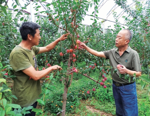 遼寧省農科院果樹所所長劉威生(右)在給果農做指導。