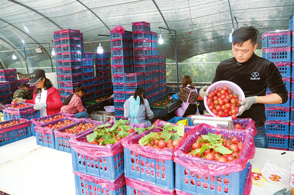 10月22日,聞喜縣后宮鄉上院村,山西維昌新型農業科技開發有限公司工人正在採摘聖女果,通過分揀包裝后,准備發往市場。近年來,該公司實行“公司+基地+扶貧車間+農戶”的運作模式,加大蔬果在運輸銷售環節的投入成本,通過精細化分揀包裝,大大促進了產品銷售。