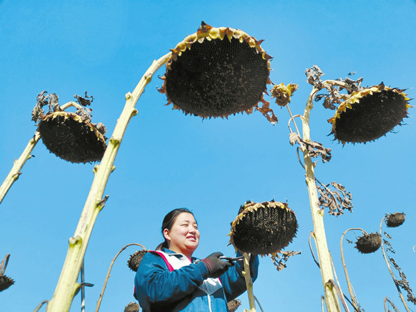 10月23日,沁水縣土沃鄉交口村農民正在採收葵花。金秋時節,沁水縣葵花喜獲豐收,當地農民抓緊晴好天氣進行搶收和晾晒,力保顆粒歸倉。近年來,沁水縣農民依托當地適宜的土壤、氣候等自然資源條件,大力發展無公害葵花種植產業,既增加了農產品的附加值,又使無公害葵花種植產業成為當地農民增收致富的品牌產業,有效促進了農業增效、農民增收。