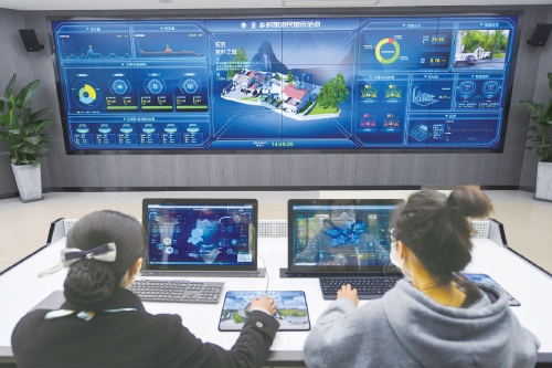 浙江省安吉縣鄉村智慧用能服務中心的工作人員在查看安吉縣靈峰街道橫山塢村民宿群的各項實時能耗數據。 新華社記者 徐昱 攝
