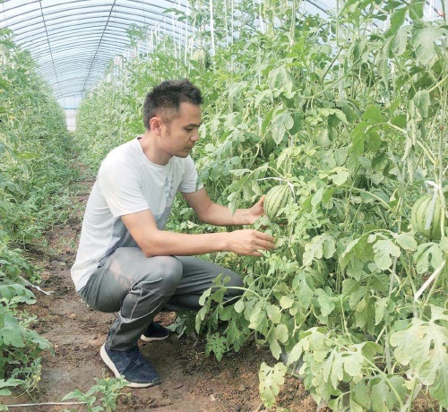任毅在大棚裡察看西瓜長勢。 資料圖