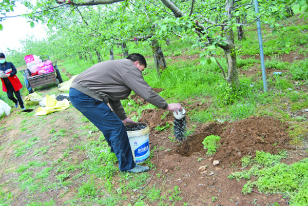平陸一果農在果園內穴施有機肥及復合肥(資料圖片)