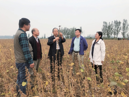 有關專家在田間考察大豆新品種“鄭1307”的長勢。
