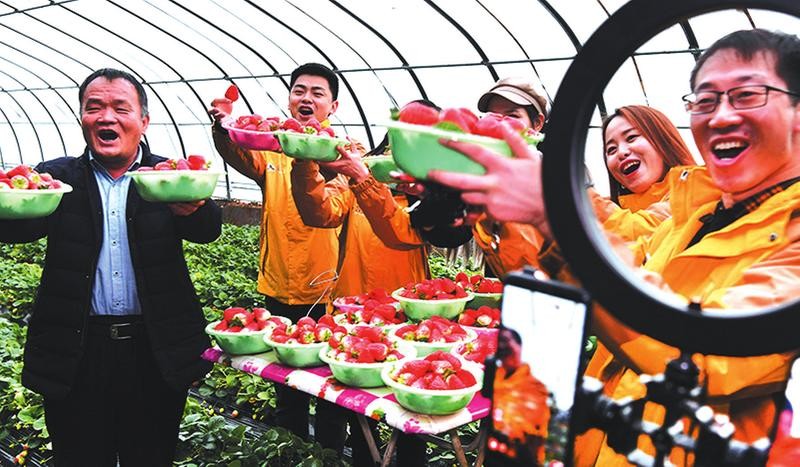 日前,陝西省渭南市合陽縣啟動“電商趕大集、致富奔小康”電子商務線上商品交易活動,電商平台深入當地田間地頭,直播帶動農產品銷售。圖為一家電商平台工作人員在合陽縣金峪鎮溝北現代農業科技示范區大棚內直播推廣剛上市的草莓。