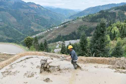3月31日,貴州省黔東南苗族侗族自治州從江縣加勉鄉白棒村農民用微耕機耕田。春耕時節,從江縣農民搶抓農時犁田耕地。近年來,適合山區梯田耕作的微耕機逐漸取代耕牛,成為黔東南山區農民春耕的“新寵”。