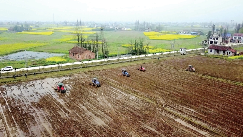 為確保春耕生產順利進行,湖南省南縣農機部門近期動員農機專業合作社組織農機開展春耕作業,組織農機服務隊深入農機專業合作社及田間地頭現場指導疫情防控、春耕備耕工作。截至目前,南縣已經組織全縣79家農機專業合作社和數百名農戶的1.8萬余台套農機具投入到春耕備耕中。圖為近日南縣南洲鎮育才村5台大型旋耕機在翻耕作業。