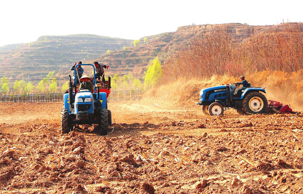 四月十三日,方山縣龍騰種養專業合作社社員正在用機器撒肥、耕地。該合作社位於方山縣麻地會鄉胡堡村,採取“統一品種、統一採購、統一供應、統一服務、統一防疫、統一 銷售”模式。目前,已帶動胡堡村十五戶貧困戶增收,每戶年收入達到三萬元左右。