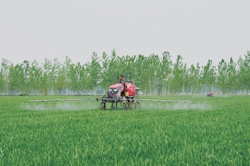 在安徽省宿州市埇橋區順河鄉萬橋村,農戶用自走式植保機給小麥噴洒農藥,防控赤霉病。 祝家剛 張大偉 攝