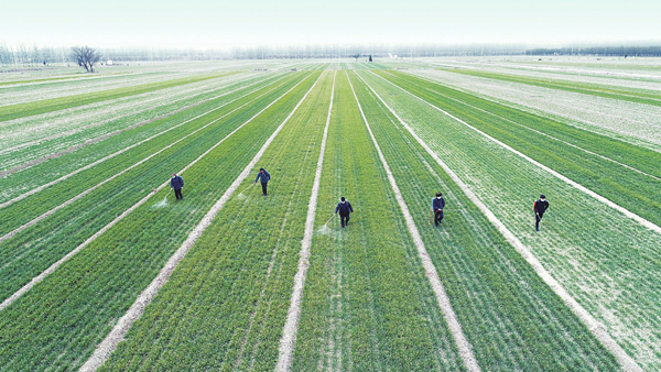 2月18日,河津市柴家鄉吳村村民正在田間給小麥施肥。該市將疫情防控工作與春耕生產同部署、同安排,專門開設農資供應綠色通道,保障農資供應,引導各村因地制宜加強田間管理,動員農民不誤農時,整地施肥有序開展春耕生產。