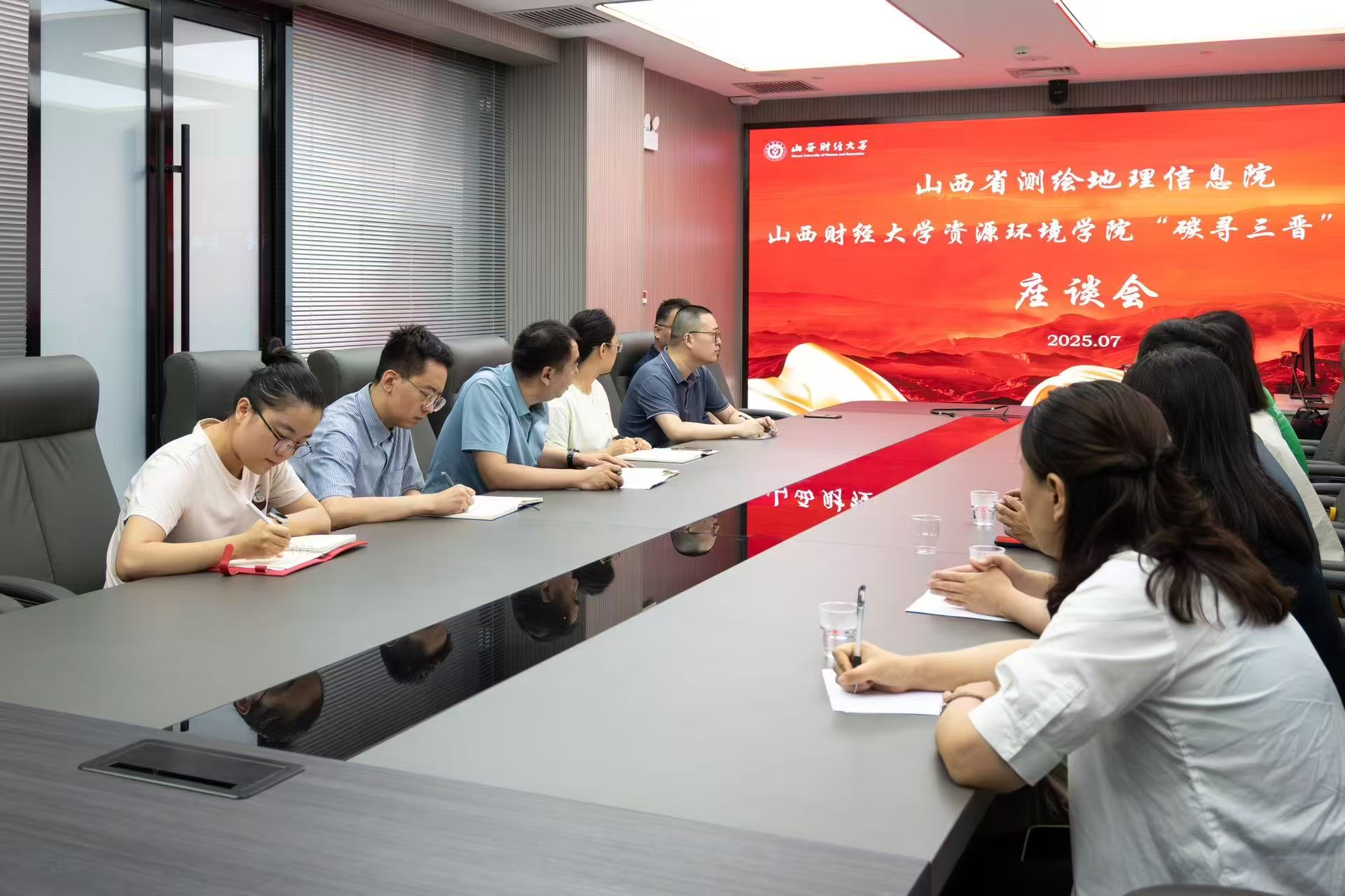随后,实践队与测绘地理信息院相关领导及技术专家进行了深入座谈。会上,省测绘院通过专题宣传片系统展示了其在服务全省发展大局中的核心职能与使命担当。专业技术人员详细介绍了该院如何运用高精度测绘、地理信息系统(GIS)等核心技术,为全省关键领域提供不可或缺的空间基底支撑与决策依据。队员们就山西省煤炭资源勘测、生态治理修复等方面提出建议,双方深入交流、积极探讨,为山西省能源绿色发展提供了新思路。