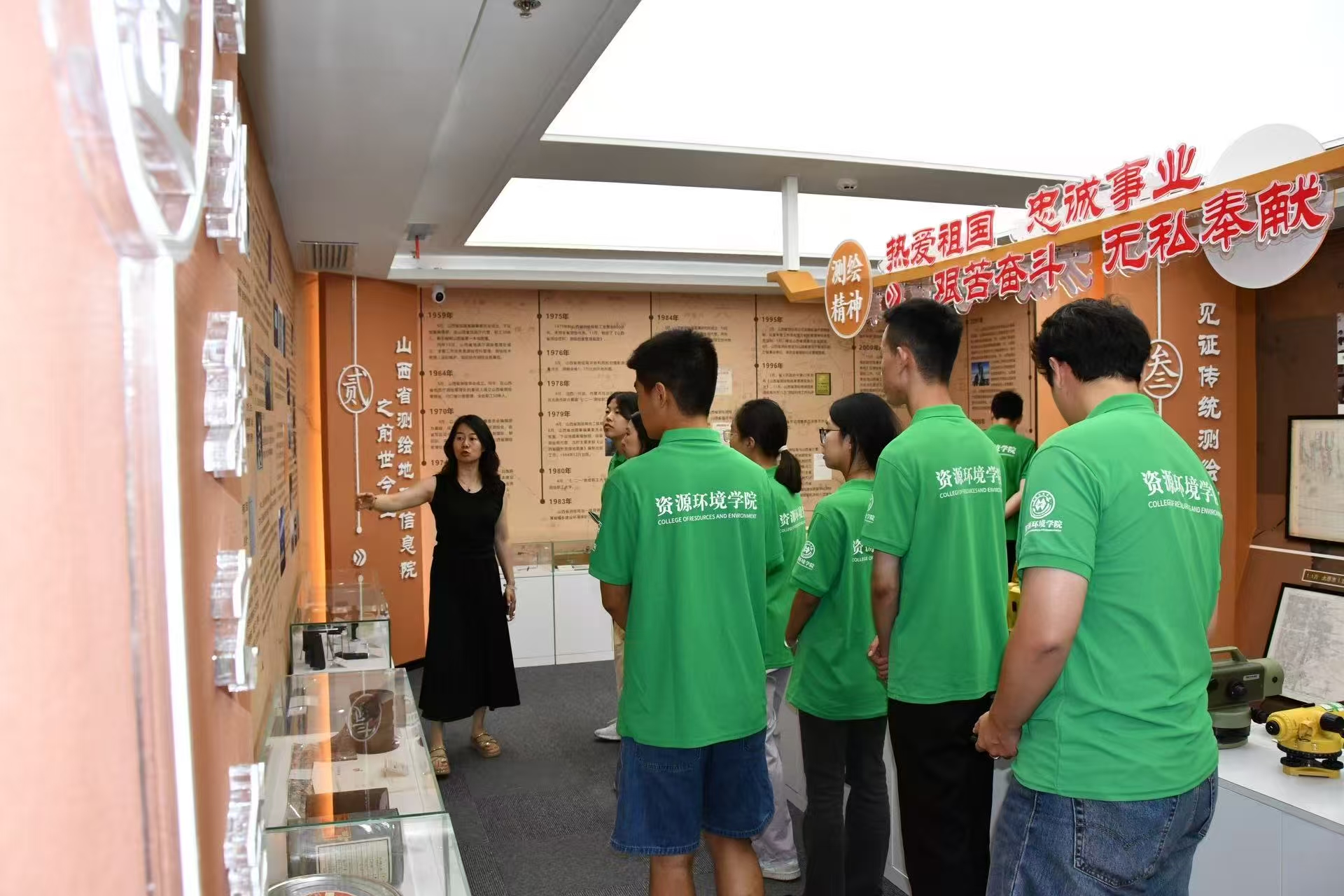 活动当天,实践队到山西省测绘地理信息院参观测绘院展厅。在沉浸式参观中,实践队员们进行了一场跨越时空的测绘技术对话,通过档案文献、设备实物(如早期经纬仪)、特色地图墙,梳理山西测绘事业发展脉络。山西省早期的铅笔手绘地形草图展现了测绘人“严、慎、细、实”的行业基因,队员们驻足凝视,见证了第一代测绘人“一根铅笔、两条腿”的峥嵘岁月。