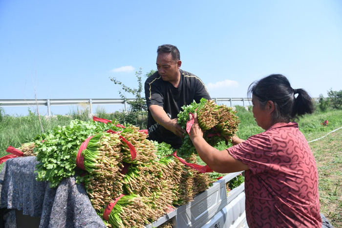 今天采收外销的是他们巧打小麦收割到小麦播种期间的土地空挡时间差,承包400亩麦茬地复播的第一茬香菜。其鲜嫩碧香、叶肥茎绿的菜色菜型受到河南客户段海龙的青睐赞赏,批发价每斤出到2.5元。