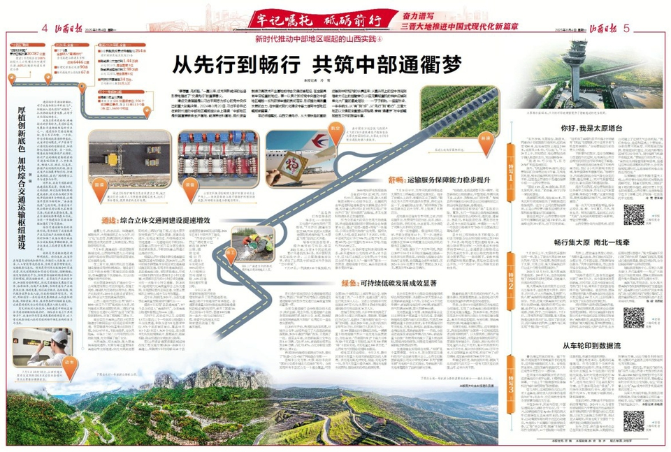牢记领袖嘱托,山西交通先行。从大秦铁路的重载运输到中欧班列的纵横往来;从直升机上的空中游览到雄奇太行上的挂壁穿行;从巨无霸起重机的特种运输到焦化大厂里的氢能短驳……一寸寸钢轨、一座座桥梁、一条条航线,从“有”到“好”,从“先行”到“畅行”,三晋大地正以交通巨变重塑山河格局,奏响“通衢梦”与中部崛起相互交织的振奋乐章。