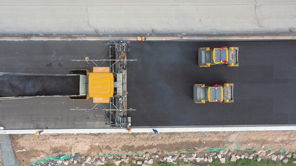 盛夏七月,热浪滚滚。伴随着机械轰鸣声,大型摊铺机正火力全开,均匀“吐”出沥青,数辆压路机次第排开,钢轮在滚烫的沥青上纵横往复,黑色路面缓缓形成。