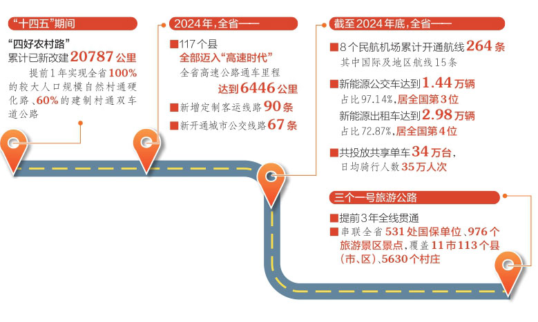 “四好农村路”“十四五”期间累计已新改建20787公里,提前完成规划目标,提前1年实现全省100%的较大人口规模自然村通硬化路、60%的建制村通双车道公路。