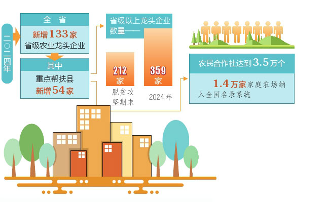 在龙头企业发挥联农带农作用方面,我省不断强链延链补链,增加经营主体数量,提升产业引领力。全省去年新增133家省级龙头企业,其中重点帮扶县新增54家。重点帮扶县的省级以上龙头企业数量由脱贫攻坚期末的212家增长到2024年的359家,农民合作社达到3.5万个,有1.4万家家庭农场纳入全国名录系统。全省脱贫地区涌现出一批“苹果村”“木耳乡”“黄花村”等专业镇、专业村,特色产业逐步发展壮大,带动脱贫群众持续增收能力有效提升。