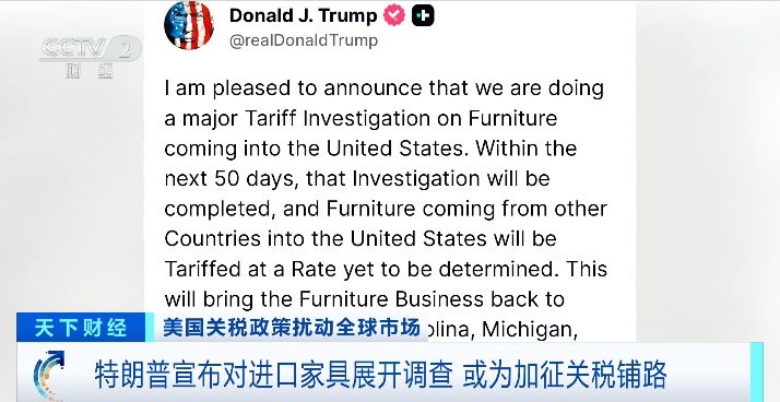 (央视财经《天下财经》)据路透社报道,当地时间22日,美国总统特朗普表示,将对进口家具进行关税调查。报道称,特朗普此举旨在为家具行业加征关税铺路。