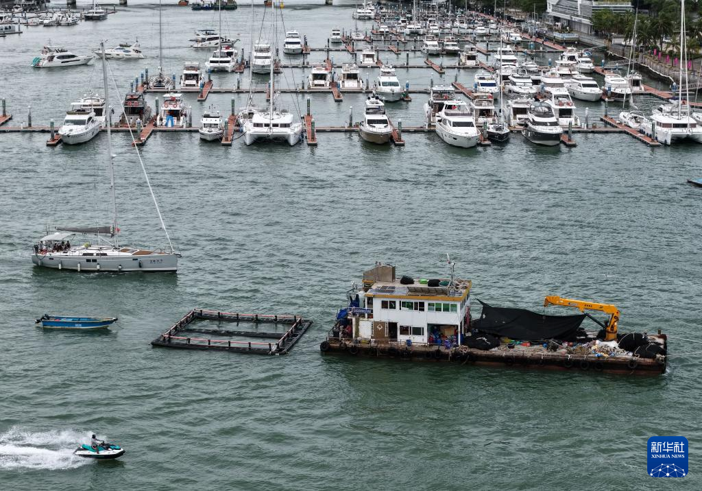 8月23日,游艇停泊在海南省三亚市鸿洲游艇码头避风(无人机照片)。