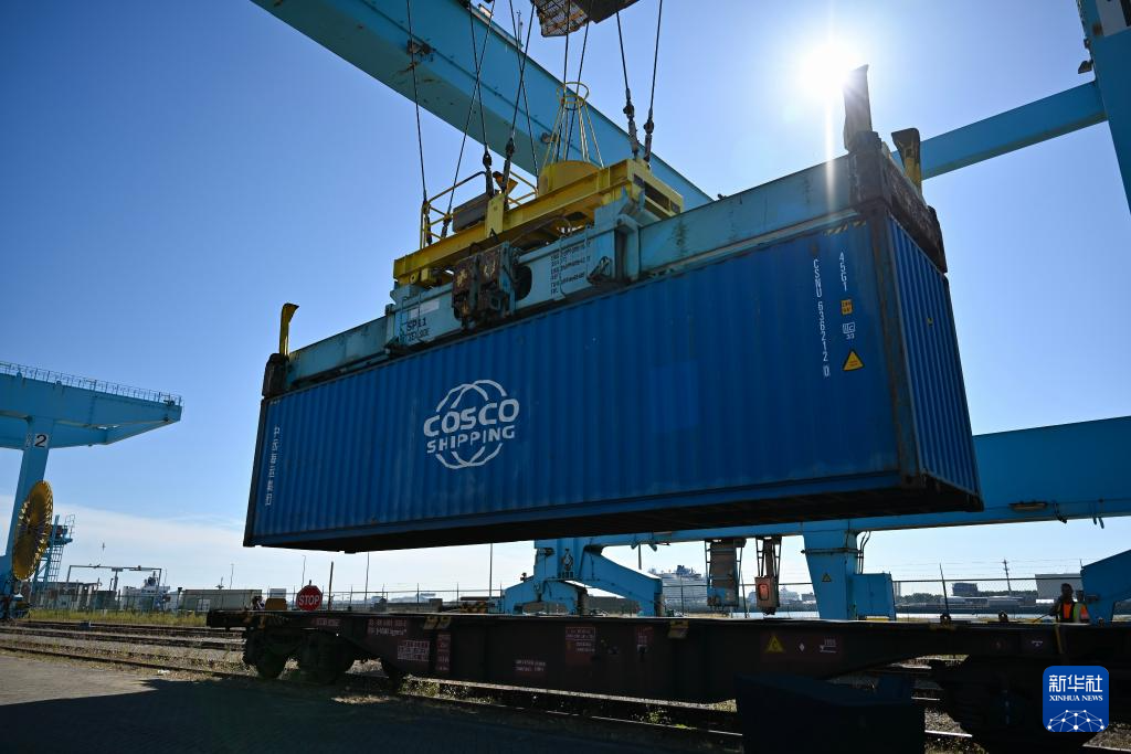 8月25日,在比利时布鲁日的泽布吕赫港码头,集装箱被装载到即将出发的首趟“泽布吕赫-曼海姆”直达铁路班列上。