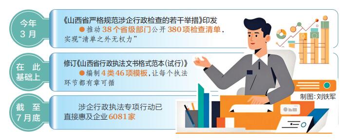建立执法清单,规范执法行为。今年3月,省政府办公厅印发《山西省严格规范涉企行政检查的若干举措》,推动38个省级部门公开380项检查清单,实现“清单之外无权力”。同时,省司法厅推动各级行政执法部门制定并公布年度行政检查工作计划,合理确定本单位对同一企业实施行政检查的年度频次上限,以及行政执法部门的职责边界。目前,已有21个省级行政检查主体公布了行政检查年度频次上限,全省上半年涉企检查总量同比下降36%。在此基础上,修订《山西省行政执法文书格式范本(试行)》,编制4类46项模板,让每个执法环节都有章可循,进一步规范执法行为。