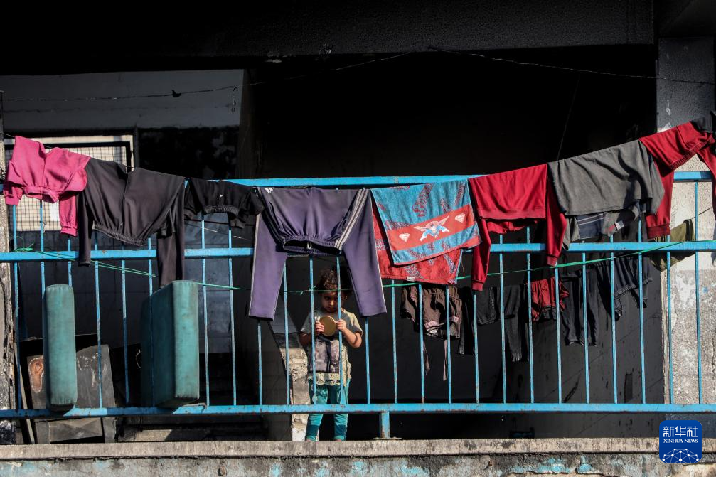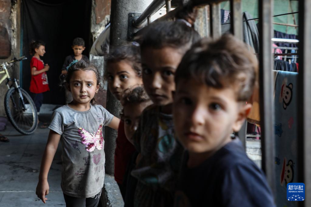 这是8月27日在加沙城西南一处避难所拍摄的巴勒斯坦儿童。