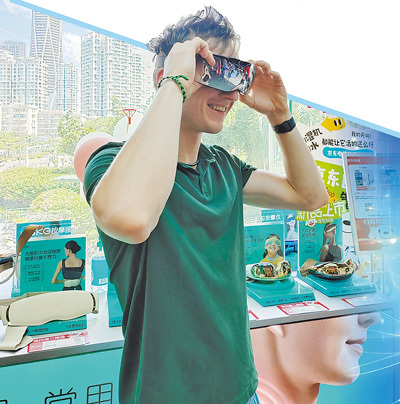 在深圳福田区华强北群星广场购物中心,来自德国的小伙子凯试戴电子眼部按摩仪。记者 洪秋婷摄