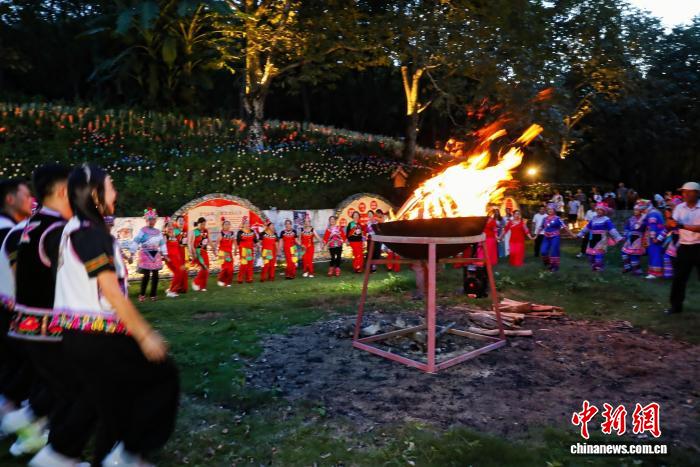 图为夜晚阿尼么村村民围着篝火与游客狂欢。 云南省委网信办 供图
