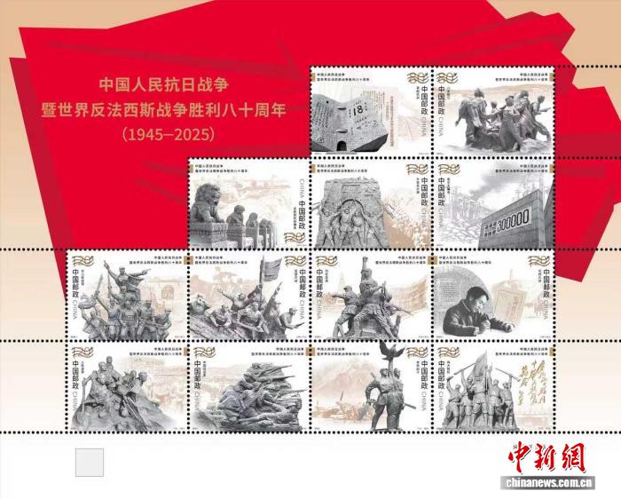 中新社北京8月28日电(记者 刘育英)记者28日从中国邮政集团获悉,中国邮政将于9月3日发行《中国人民抗日战争暨世界反法西斯战争胜利八十周年》纪念邮票1套13枚和小型张1枚,全套面值为20.8元人民币。邮票计划发行数量为600万套、小型张为500万枚。