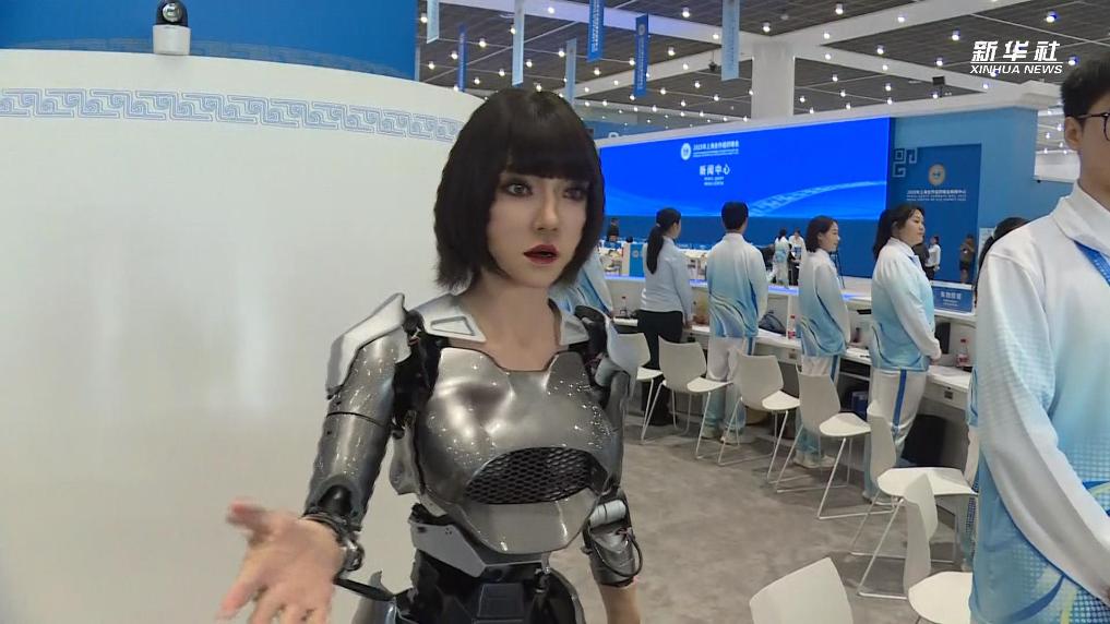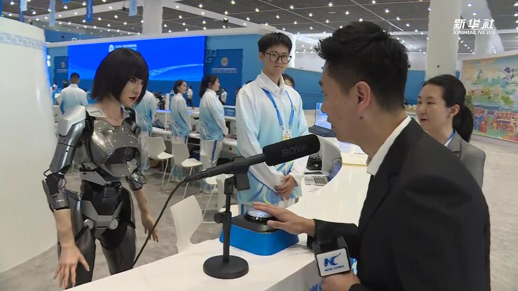 人形机器人“小合”能够使用十国语言,与各国记者交流。