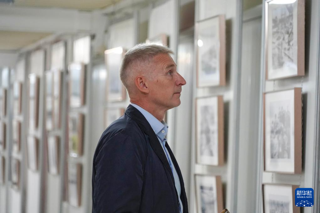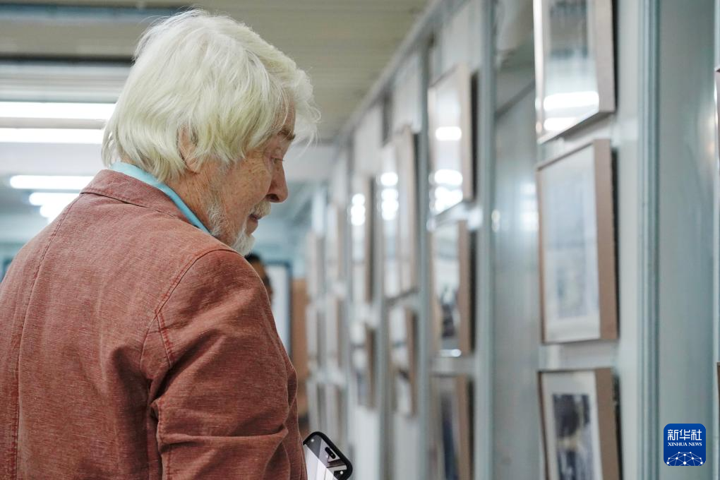 8月28日,在俄罗斯圣彼得堡,一名男子参观纪念中国人民抗日战争暨世界反法西斯战争胜利80周年图片展。