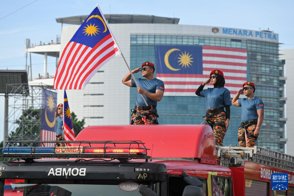 8月31日,消防员在马来西亚布特拉加亚参加马来西亚独立68周年庆典活动。