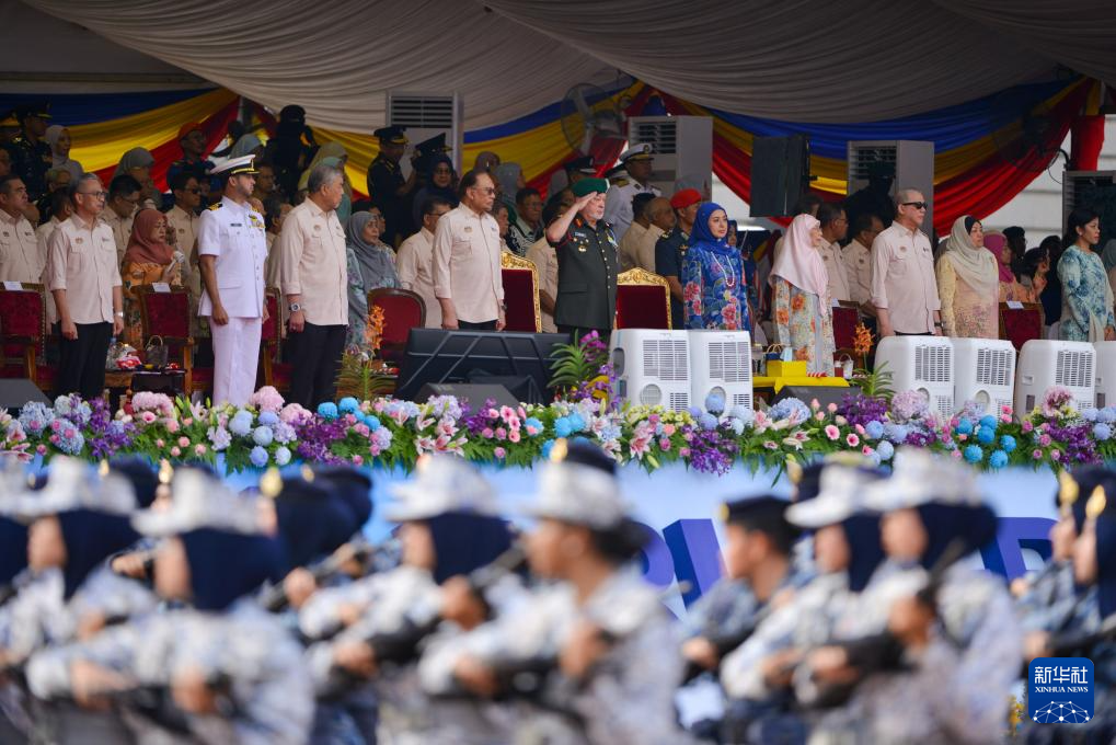8月31日,马来西亚最高元首易卜拉欣(前排左五)和马来西亚总理安瓦尔(前排左四)在布特拉加亚出席马来西亚独立68周年庆典活动。