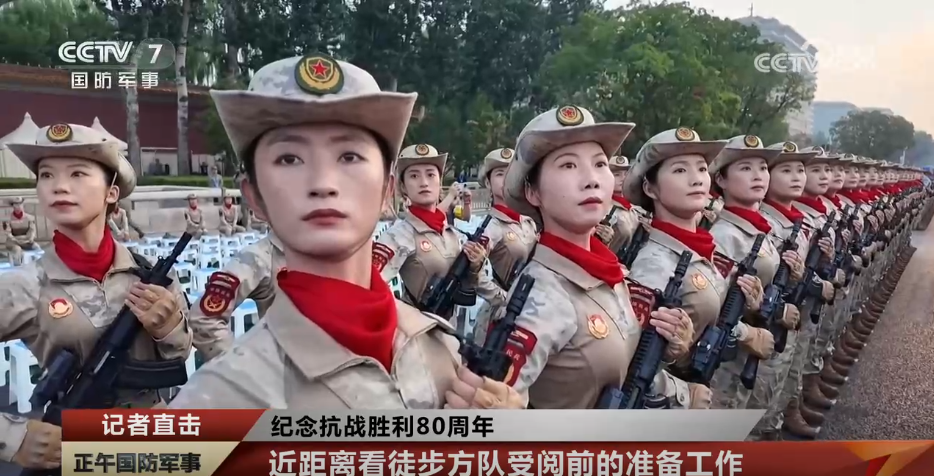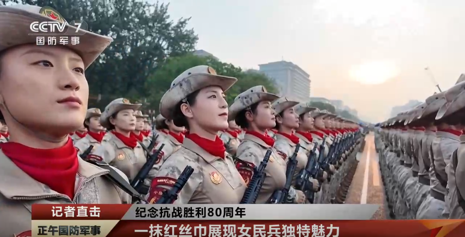 顺着镜头可以看到,距离记者最近的是民兵方队,这次方队中的女民兵身穿迷彩“蛙服”,手持钢枪,让人联想到英姿飒爽的“花木兰”形象。她们来自全国15个省份,其中不少是来自创造了地道战、地雷战、麻雀战等独特战法发源地的典型民兵组织,来源地覆盖抗战时期党领导的主要抗日根据地。