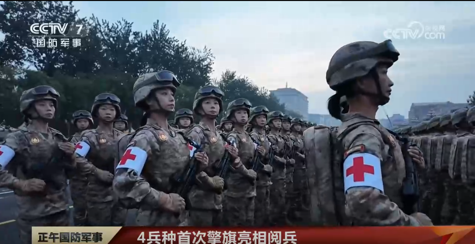 军事航天部队、网络空间部队、信息支援部队、联勤保障部队4支兵种各自组成的受阅方队也是首次擎兵种旗亮相阅兵,他们身着迷彩服,手持新式步枪。联勤保障部队方队男女混编,女兵还背着印有红十字的急救背包,完全是以战斗编组的样态亮相。能感受到他们随时待战随时能战的能力素质。