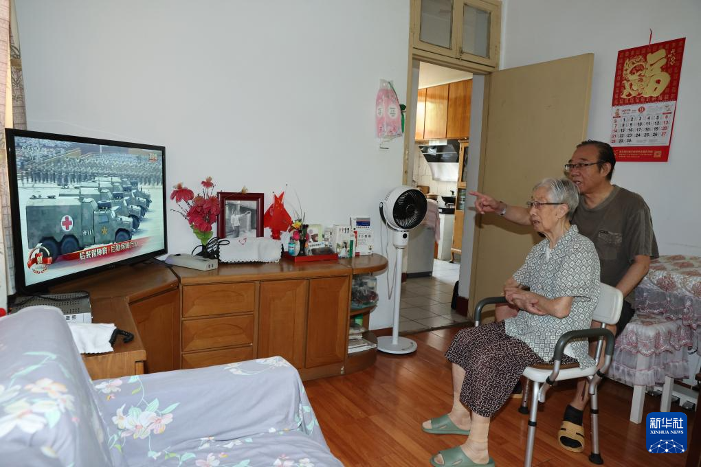 9月3日,在山东省枣庄市薛城区临城街道,老兵郑亚芹(左)和家人一起观看纪念中国人民抗日战争暨世界反法西斯战争胜利80周年大会直播。