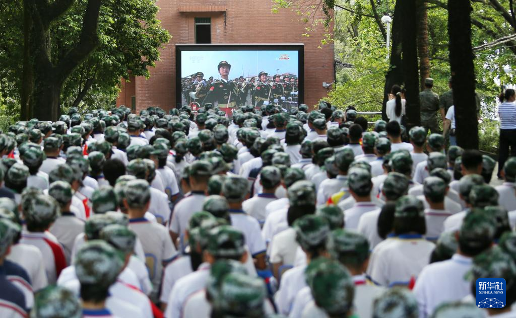 9月3日,广东省鹤山市第一中学的师生在观看纪念中国人民抗日战争暨世界反法西斯战争胜利80周年大会直播。