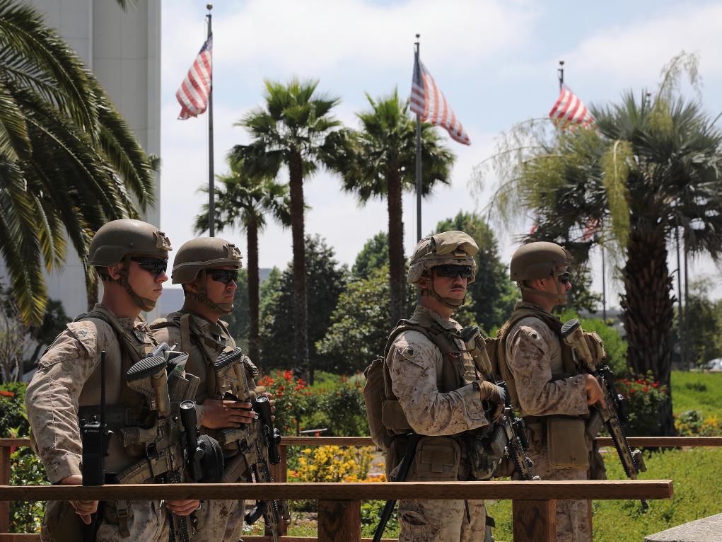 6月13日,美国海军陆战队士兵在洛杉矶威尔希尔联邦大楼的入口处站岗。新华社发(邱晨摄)