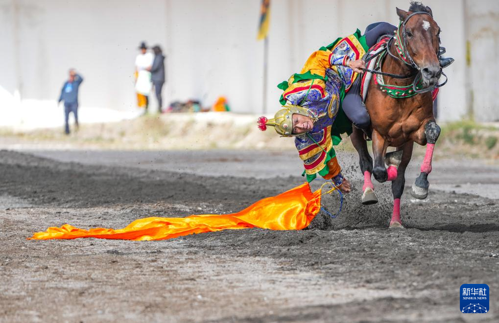 9月5日,骑手在2025年那曲市恰青赛马节表演传统骑射。
