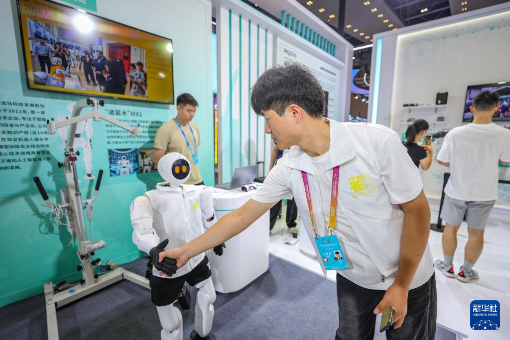9月5日,在2025世界智能产业博览会现场,参展商和人形机器人互动。新华社记者 黄伟 摄