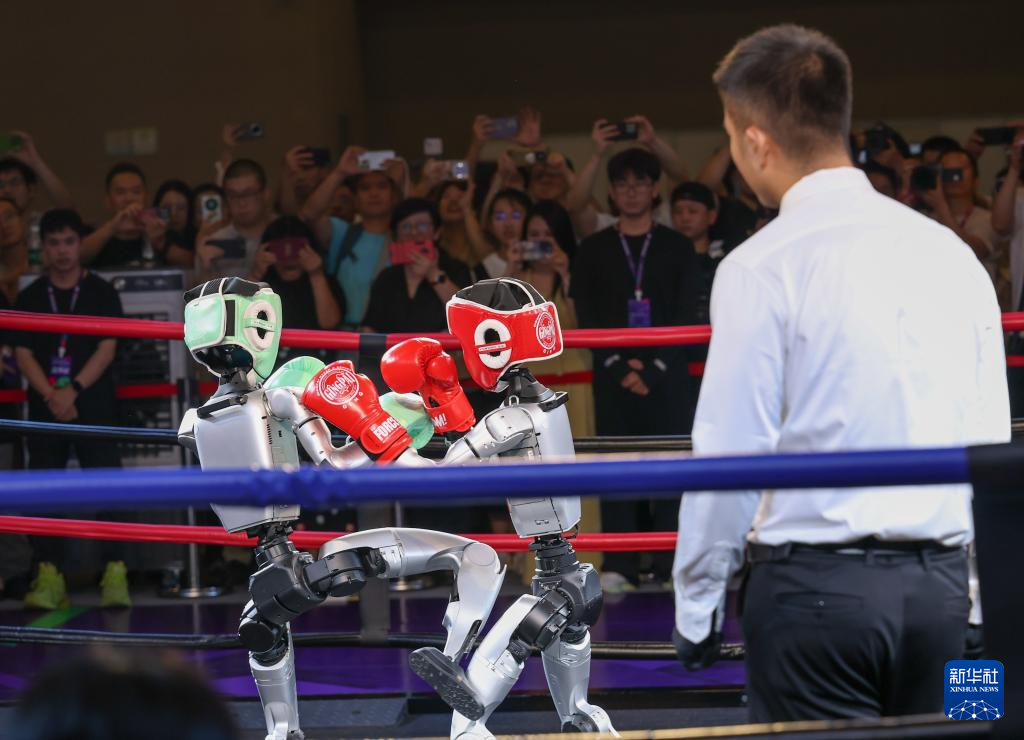 这是9月5日在2025世界智能产业博览会上拍摄的人形机器人拳击比赛。新华社记者 陈诚 摄